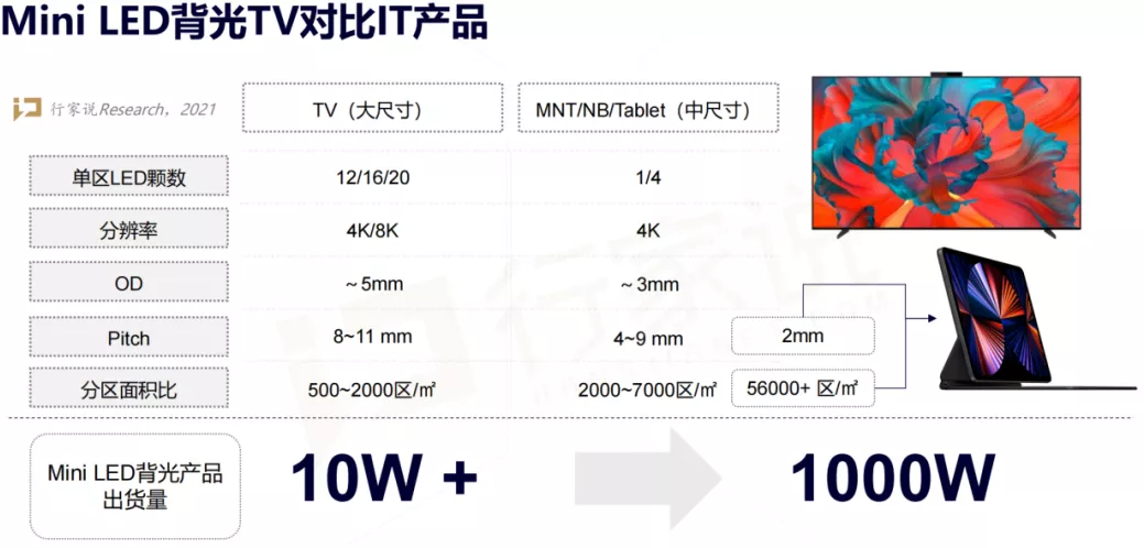 就Mini LED技术而言,已发布的显示器产品相较于大尺寸TV,显示器产品单区LED数更少,OD方面也更为苛刻,分区面积比也更高。