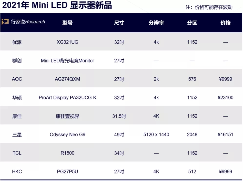 在今年,不只是三星、TCL、康佳等Mini LED的重要玩家,AOC、HKC、华硕作为显示器的知名品牌,今年推出Mini LED显示器,进一步推动了Mini LED的规模商业化。