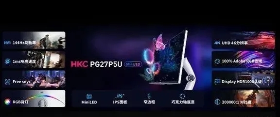 HKC新品显示器型号为PG27P5U,主要定位高端全场景显示器,不仅仅用于电竞,视觉设计、影视后期等皆是HKC此次的目标。