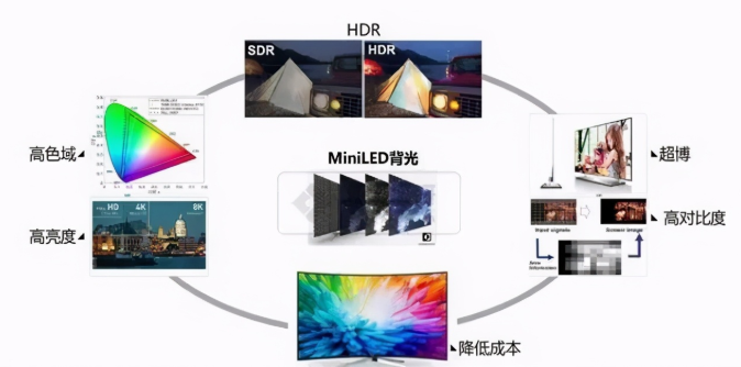 目前,电视市场主要有两种面板,LCD和OLED。OLED的优点是让画面显得更纯净,不过也有成本高、亮度有限、寿命较短等缺陷。而Mini LED,恰好兼顾了LCD和OLED的优点,Mini LED技术指标站在显示行业前列,且同性能下成本有望走低,和OLED拉出明显价格差,因此被视作显示产业的未来,成为电视行业重点发力的核心技术。