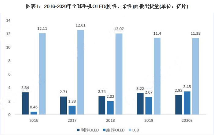 硬屏OLED面板由于受限于应用场景的需求,出货量预计在未来的增长较为缓慢,2019年全年出货量为3.22亿片。柔性OLED面板市场需求旺盛,行业发展速度加快,出货量从2016年的0.46亿片到2019年已经增长了约6倍,达到2.02亿片,具有很大的市场需求潜力。