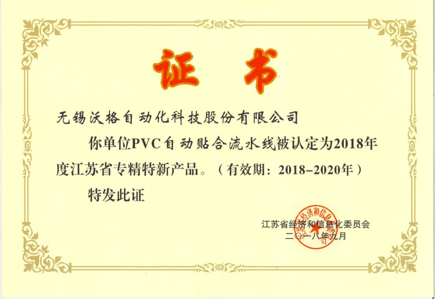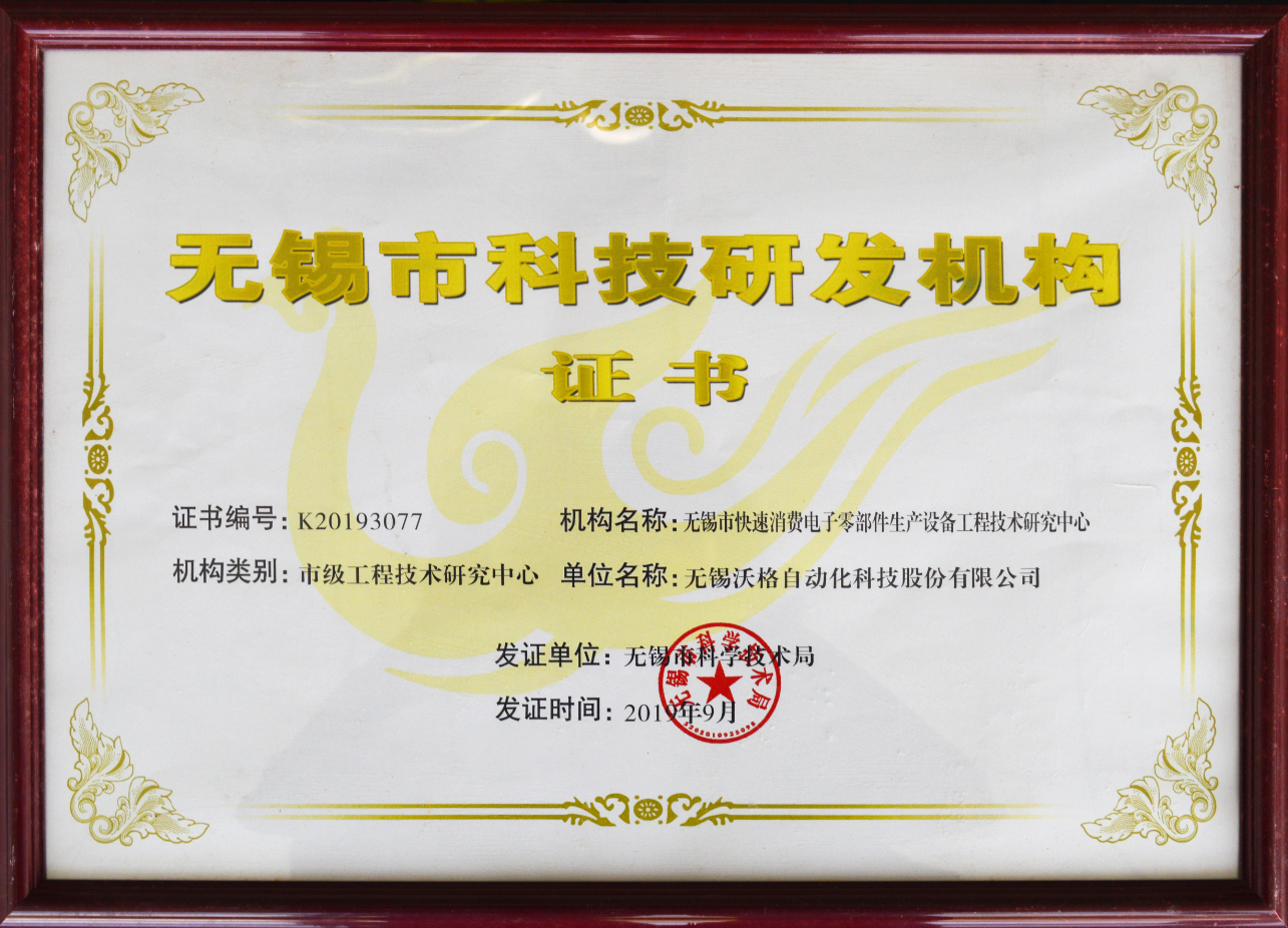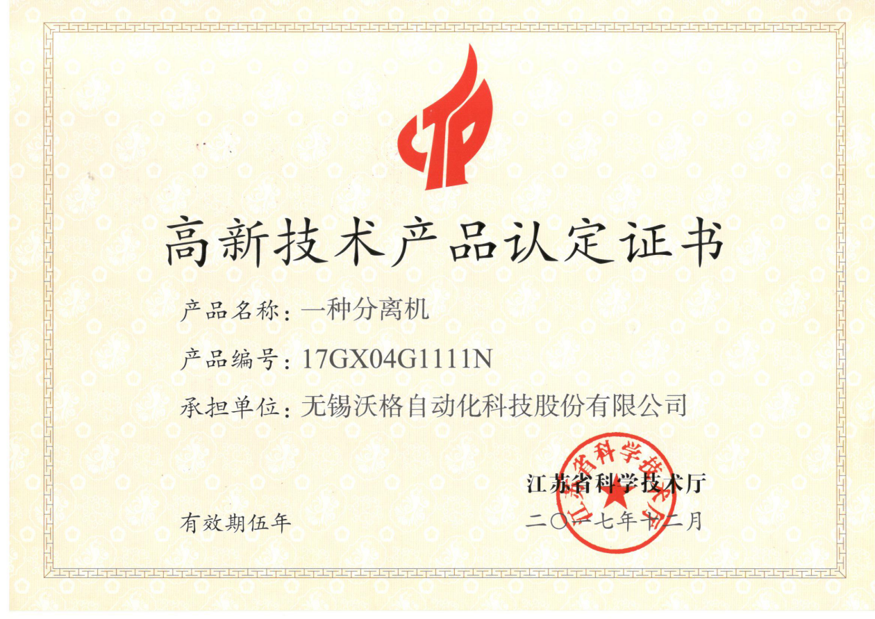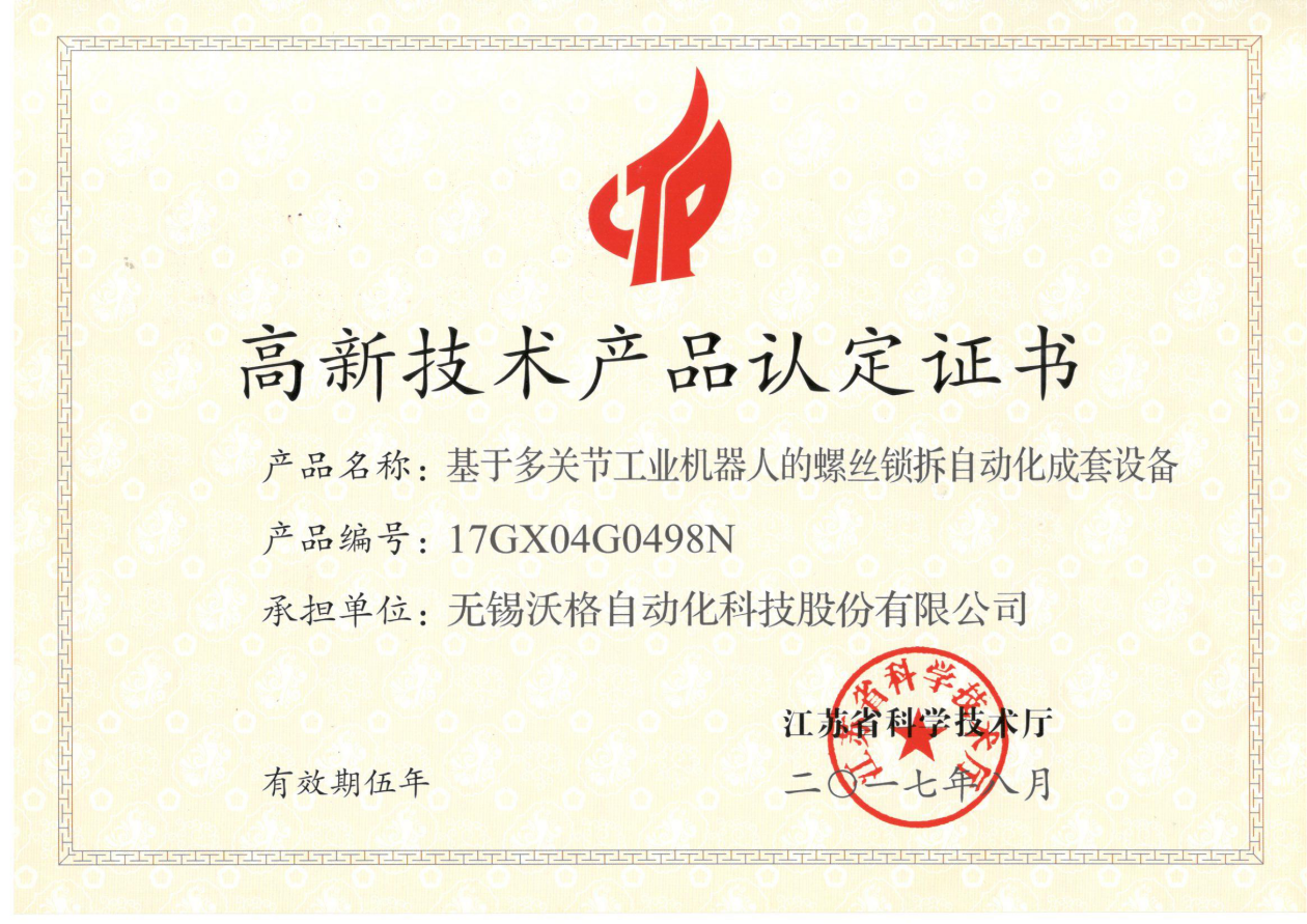 近年来,公司先后获得的高新技术产品认定证书有“锂电池曲面热压机”、“ 全自动三边密封机”、“ 一种地板废料剔除机”、“ 一种用于锂电池生产的设备”、“一种线束插管剥皮机”、“基于多关节工业机器人的螺丝锁拆自动化成套设备”等。